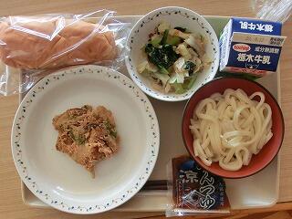 今日の給食は、ミニアップルパン、牛乳、冷やしうどん、ごぼうかきあげ、梅かつお和えです。