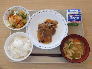 今日の給食は、ごはん、牛乳、豚肉のしょうが焼き、豆腐サラダ、五目スープです。