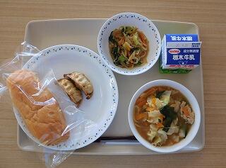 今日の給食は、ミニパインパン、牛乳、味噌ラーメン、揚げぎょうざ、チンゲン菜の中華サラダです。
