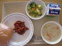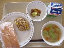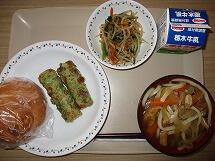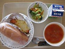 今日の給食のメニューは、「焼きそばパン 牛乳 えびしゅうまい 中華野菜スープ」でした。