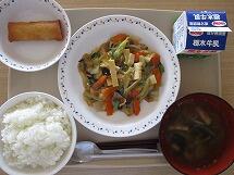 今日の給食のメニューは、「ごはん 牛乳 中華丼の具 春巻き わかめスープ」でした。
