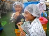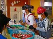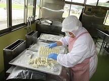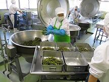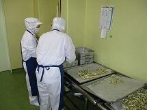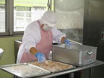 鶏肉の唐揚げは、給食室で下味をつけ、片栗粉をまぶして一つ一つ丁寧に油で揚げています。みんな大好きで、小さく切り分けたおかわりには、おおぜいの子供達が集まっていました。