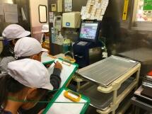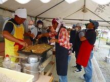 「ぎょうざ」は、宇都宮ぎょうざが有名で、皆さんもよく食べる料理だと思いますが、もともとは中国の料理です。その歴史はとても古く、中国の紀元前の遺跡からも、ぎょうざらしきものが見つかっているそうです。今日のぎょうざは、栃木県産のニラを使って作ったものです。にらも、栃木県で有名な食材ですね。焼きそばは、大きな回転釜というお鍋で作っています。量が多いので、混ぜるのにも力が必要ですが、皆さんがよろこぶ笑顔を思い浮かべながら作っています。