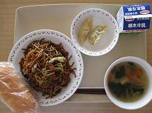 今日の給食のメニューは、「ミニパインパン 牛乳 焼きそば 焼ぎょうざ 豆腐と野菜のスープ」でした。