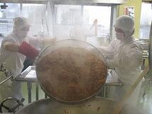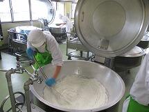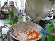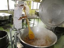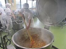 給食室で焼きそばを作る時は、先に肉や野菜を炒め、その中に蒸した焼きそば麺を入れて作っています。大量の麺は、とても重いので2人がかりで鍋に投入します。麺から立ち上る湯気で写真が白くかすんでしまっていますね。