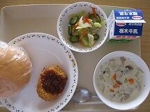 今日の給食のメニューは「コロッケサンド 牛乳 ヘルシーサラダ きのこのチャウダー」でした。