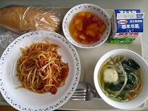 今日の給食のメニューは、「ミニアップルパン 牛乳 ツナとトマトのスパゲティ えびボールスープ フルーツポンチ」でした。