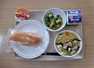 今日の献立は、アップルパン、牛乳、ちゃんぽん麺、ゆで野菜サラダ、アセロラゼリーです。