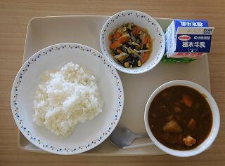 今日の献立は、ごはん、牛乳、チキンカレー、ほうれんそうともやしのソテーです。