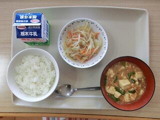 今日の献立は、ごはん、牛乳、マーボー豆腐、中華和えです。