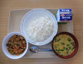 今日の献立は、ごはん、牛乳、豚肉のスタミナ焼き、生揚げときぬさやの味噌汁です。