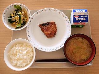 今日の給食は、ごはん、牛乳、カツオの揚げ煮、こまつなのレモン和え、根菜のごま汁です。