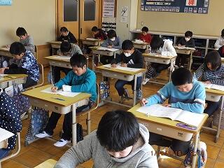 本校では、朝登校してから朝の会までの15分間を朝の学習の時間とし、算数の計算練習や国語の作文練習などに取り組んでいます。今日は、5・6年生合同で『小数のわり算をマスターしよう』と3つのコースに分かれた学習を行いました。自分の力に合った課題ということで、時間いっぱい集中して取り組む様子が見られました。