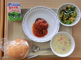 今日の給食は、セルフハンバーガー、牛乳、小松菜とコーンのサラダ、クラムチャウダーです。