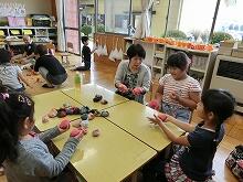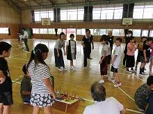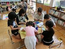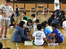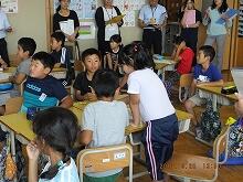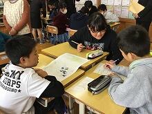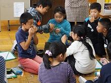 たくさんの円が描いてある紙が配られ、円を利用して果物や動物の略図を、グループで相談、工夫してたくさん描きました。上手なグループには後で校長先生から賞品がもらえます。