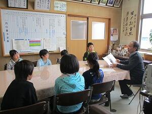 業間の時間に朝会を行いました。校長先生のお話ですが、ワールドグループでの話し合い活動です。学校教育目標達成のための重点的取組「異年齢活動等により思いやりやリーダーシップを育成する」「発表したり、意見・質問を述べたりする機会を、積極的・計画的に持つ」2つを具体化したものです。今日から5年生がリード役に切替です。