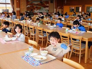ランチルームでは、新5・6年生がそろって給食を食べています。