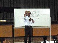 後半に体験コーナーがあり、代表の児童がマリンバやドラムスを体験し、校歌に合わせて演奏をしました。また、いろいろな楽器の説明もしていただき、楽しい時間となりました。