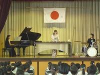 後半に体験コーナーがあり、代表の児童がマリンバやドラムスを体験し、校歌に合わせて演奏をしました。また、いろいろな楽器の説明もしていただき、楽しい時間となりました。