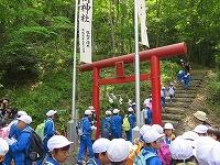 ↑ 急な山道を登って、ようやく山頂に到着!!山頂では、宮司さんからお話を聞き、みんなでお昼を食べました