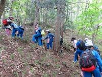 ↑ ワールドグループごとに高富士山のふもとを目指します。上級生が下級生に優しく声をかけ、励ます姿も見られました。高富士山のふもとでは、地域の方からお話をうかがいました