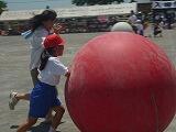 3・4年生の競技です。『上陸!千塚タイフーン』では、長い棒を友達と協力して持ち、カラーコーンを素早く回りました。親子競技の大玉転がしでは、親子で協力しながら力を合わせ、大玉をまっすぐ運びました。ダンスではEXILEの曲をかっこよく踊りました。