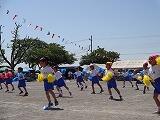3・4年生の競技です。『上陸!千塚タイフーン』では、長い棒を友達と協力して持ち、カラーコーンを素早く回りました。親子競技の大玉転がしでは、親子で協力しながら力を合わせ、大玉をまっすぐ運びました。ダンスではEXILEの曲をかっこよく踊りました。