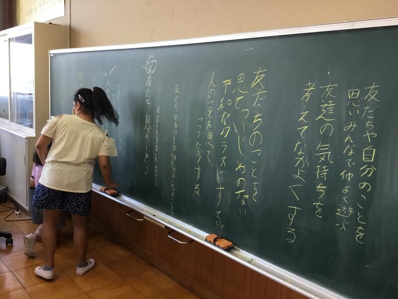 1学期にクラスのめあてを決め、教室に大きな虹の目標を掲示しました。みんなで時間をかけて、協力して仕上げました。子どもたちの頑張っている過程をご覧ください。2学期も気持ちの良いスタートが切れました!!