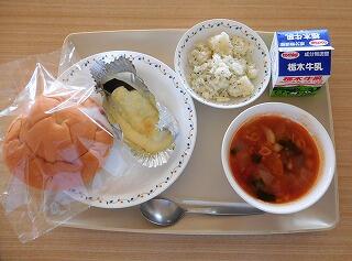 今日の給食は、はちみつパン、牛乳、シロイトタラのチーズマヨネーズ焼き、粉ふきいも、ミネストローネです。