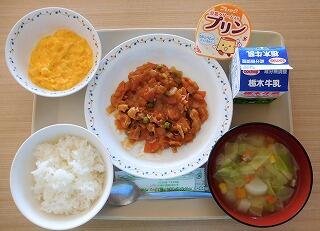 今日の給食は、セルフオムライス、牛乳、野菜スープです。