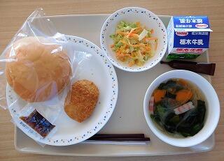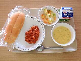 今日の給食は、背割りコッペパン、ミートサンドの具、牛乳、ヘルシーサラダ、コーンポタージュです。
