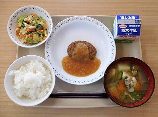 今日の給食は、ごはん、牛乳、和風おろしハンバーグ、キャベツの和風サラダ、豚汁です。