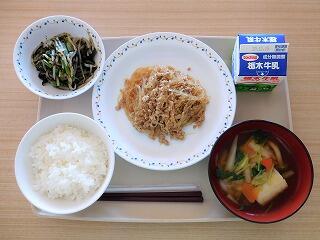 今日の給食は、ごはん、そぼろ丼の具、牛乳、磯か和え、きりたんぽ汁です。