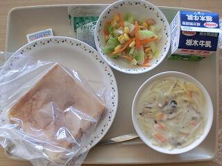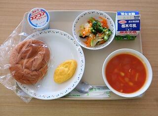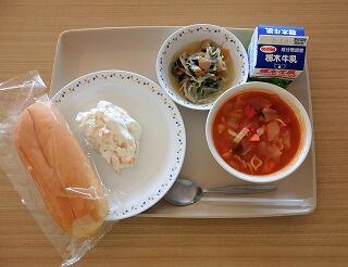 今日の給食は、フルーツクリームサンド、牛乳、もやしのソテー、ミネストローネです。