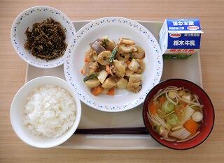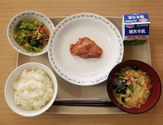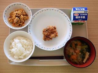今日の給食は、ごはん、牛乳、鶏肉のからあげ、しもつかれ、かんぴょうの味噌汁です。