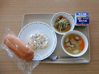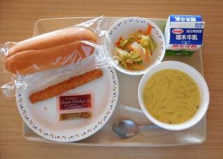 今日の給食は、お魚ドッグ、牛乳、ヘルシーサラダ、コーンポタージュです。