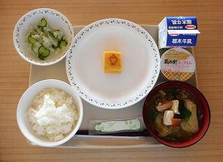 今日は栃木県産のアユを使った献立です。詳しくはちょこっと食通信を見てください。汁には、栃木県産のかんぴょうが使われています。かんぴょうは、緑色の大きな夕顔の実を機械でくるくると、ひも状にむき、干してつくります。栃木県でつくられるかんぴょうの量は日本一で、全国における生産量の90%以上も占めています。生産者の方々への感謝の気持ちを忘れずにいただきましょう。