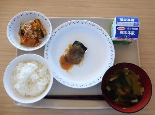 今日の給食は、ごはん、牛乳、さばのみそ煮、かぼちゃのそぼろあんかけ、ゆばのすまし汁です。