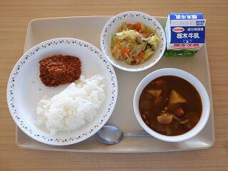 今日の給食は、ごはん、牛乳、チキンカレー、ヒレカツ、野菜ソテーです。