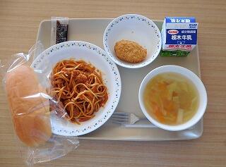 今日の給食は、ミニミルクパン、スパゲティミートソース、コーンコロッケ、白菜スープです。