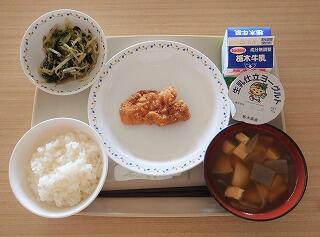 今日の献立は、ごはん、牛乳、鶏肉のからあげ、ほうれん草のごまあえ、けんちん汁、ヨーグルトです。