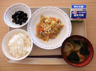 今日の給食は、ごはん、牛乳、豚肉とキャベツのみそ炒め、黒豆、お雑煮です。