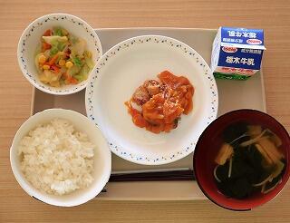 今日の給食は、ごはん、牛乳、ヤシオマスフライ、ひじきの炒め煮、かき玉汁、しもんちゃんいちごゼリーです。