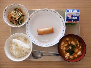 今日の給食は、ごはん、マーボー豆腐、春巻き、中華和えです。