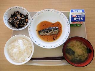 今日の給食は、ごはん、味のり、牛乳、さばの塩焼き、昆布漬け、いなか汁です。