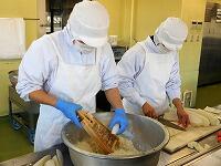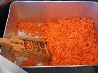 大きな鍋に、鮭、にんじん、大根、福豆、油揚げ、酒かすを入れて煮込み、砂糖と醤油で味をつけたらしもつかれの完成です!
