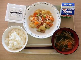 今日の給食は、ごはん、栃木市産麦納豆、牛乳、肉じゃが、もやしとわかめの味噌汁です。