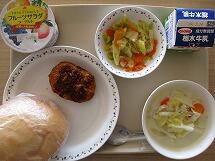 今日の給食のメニューは、「ごはん 牛乳 照り焼きハンバーグ 昆布漬け もやしのスープ」でした。