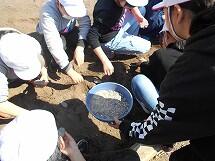 種芋を半分に切り、切り口に灰を付け、土に肥料をまいてから