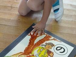 体育館半面を広く使用して、ジャンボかるた取りを実施しました。参加希望者を募り、全部で4回行いました。人数の多い・少ない、取り札がすぐ近く・はるか遠く、じゃんけんに勝った・負けた、すべては時の「運」! 運を引き寄せ、学年・年齢に関係なく、吹上・千塚地区の名所や文化にかるたを通してふれ合うひとときでした。